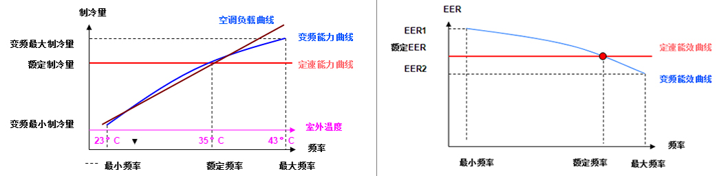 The energy-saving evaluation of the flexible chiller is determined according to the rated capacity and the energy efficiency value under the rated working conditions. The index can be qualitatively evaluated as the relative evaluation index of the laboratory test, which can relatively evaluate the energy saving of different chillers under the rated capacity. . However, it cannot truly reflect the energy-saving effect of the chiller during actual use and operation. The energy efficiency index of the fixed frequency chiller only considers the energy-saving characteristics of the rated load under the rated working condition. The figure below shows the comparison of the refrigeration capacity and refrigeration efficiency range of the inverter chiller and the fixed frequency chiller.