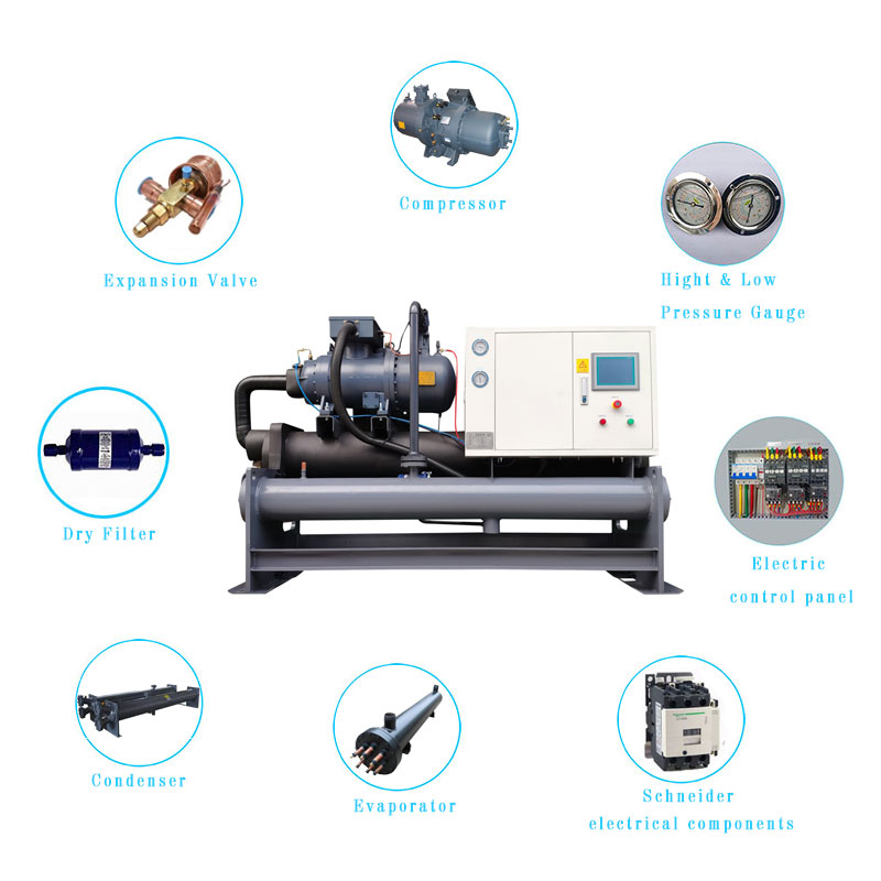 Water cooled screw chiller can be divided into two types: single-screw chillers and double-screw chillers and select the most efficient semi-enclosed compressor unit’s heart - high quality imported screw compressor, its 5:6 ultra -efficient helical rotor compressor is 20%~30% better than the general compressor unit. reliable operation, high efficiency, easy maintenance, accurate control and wide application range. The whole machine controls the temperature accurately. Units PLC controller uses large-screen touch LCD to display, and has a good all-Chinese man-machine dialogue interface to realize fully automatic control. The liquid crystal display screen displays the working condition of the machine in real time and precisely monitors the unit running in the best condition, its contact panel is well sealed, waterproof, dustproof, anti-corrosion, long key life.
